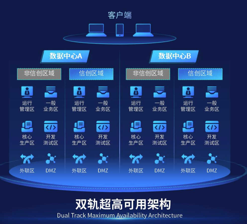 通过架构的革新,神州云科首次在业界提出了双轨超高可用架构(DTMAA)。所谓DTMAA,是神州云科为满足企业面临自主创新IT基础重构所推出的全新架构, 架构在双活数据中心的分区调度基础上,添加每个数据中心内信创域和非信创域的分域调度,来实现分区分域协同的多活双轨超高可用。帮助客户在新架构下,提升应用可持续性,解决性能瓶颈,提升稳定性,在服务异常情况下,可以通过实时灰度调度的方式,切换流量,保留应用故障现场环境,便于后续的排错与根因定位。